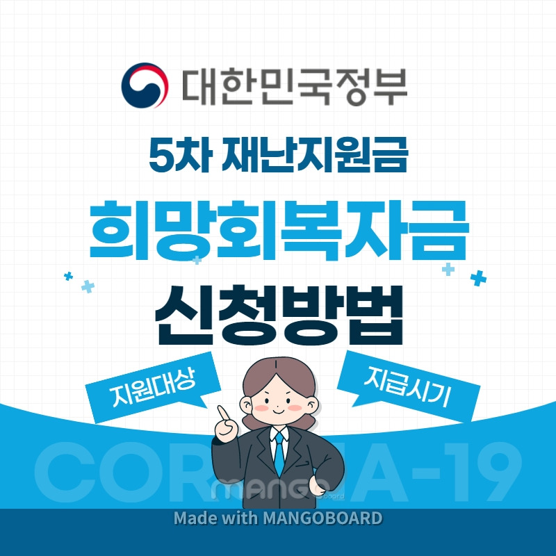 안내 문자메시지를 받는대로 누리집(희망회복자금.kr)을 통해 신청하면 된다. 코로나19 방역 조치로 피해를 입은 소상공인을 대상으로 한 5차 재난지원금, '희망회복자금'이 오는 17일부터 지급을 시작합니다. 집합금지 '6주' 이상시 희망회복자금 최대 2천만원 받는다. 5차 재난지원금은 선별 지급을 논의하고 있습니다. 상위 12% 고소득자를 제외한 국민들께 1인당 25만원재난지원금이 지급됩니다.영업금지, 제한조치로 손실을 본 소상공인분들께 희망회복자금 최대 2천만원이 지급될 예정입니다.조속히 코로나를.
